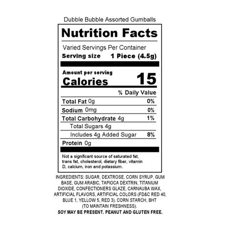 With a generous helping of classic chunk dubble bubble gum, dubble bubble gum balls, and cry baby extra. 20 calories, 0 g fat, 0 mg sodium, 5 g carbs (0 g fiber, 3 g sugar), 0 g protein. Ingredients in dubble bubble gum include dextrose, corn syrup, gum base, tapioca dextrin, titanium dioxide, confectioners glaze, carnauba wax,.